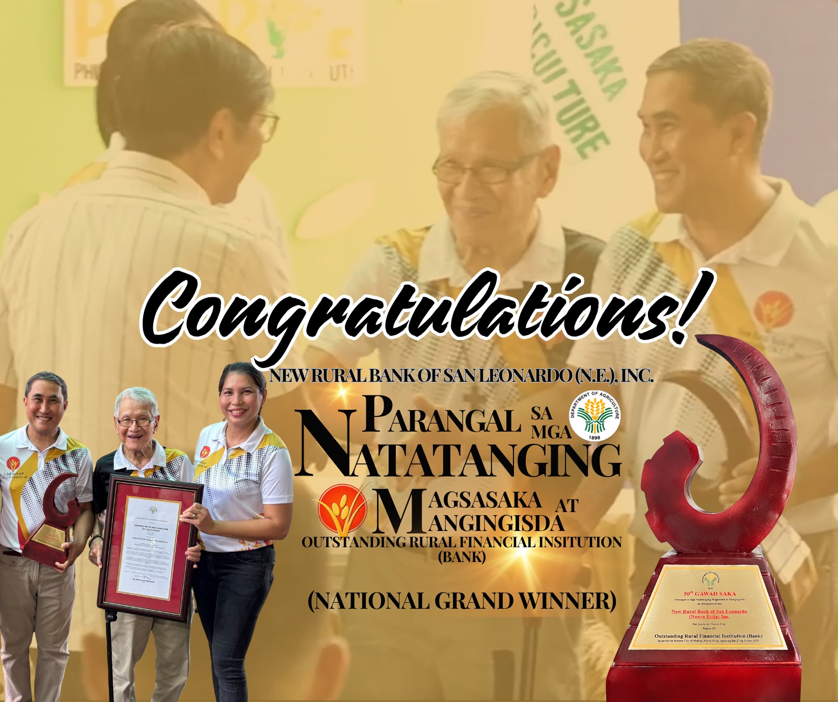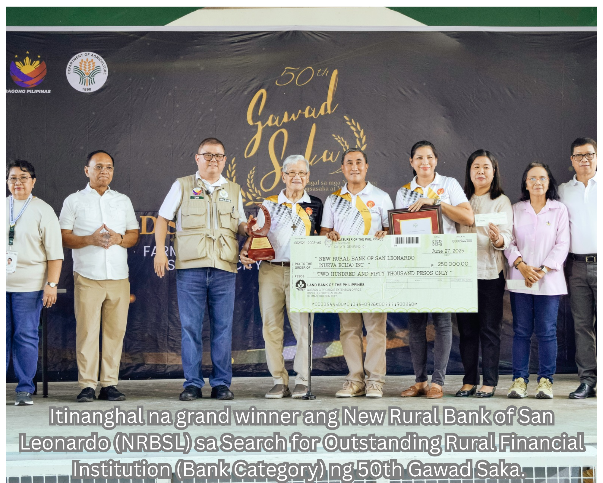 New Rural Bank of San Leonardo (N.E) Inc., named National Grand Winner for Outstanding Rural Financial Institution (Bank) during the 50th Gawad Saka: Parangal sa mga Natatanging Magsasaka at Mangingisda conferred on June 30,2025 at the Philippine Rice Research Institute in Science City of Munoz, Nueva Ecija.