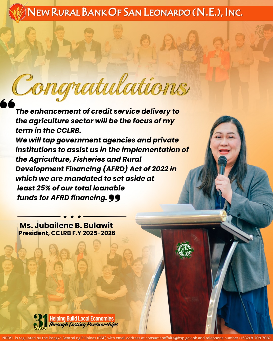 In a significant milestone for the rural banking sector in Central Luzon, Director and Vice President Jubailene B. Bulawit of the New Rural Bank of San Leonardo (N.E.), Inc. has officially assumed the presidency of the Confederation of Central Luzon Rural Banks for Fiscal Year 2025–2026. The induction ceremony of the newly elected officers was held at the Widus Hotel, Clark Freeport, Pampanga, on Monday September 15, 2025.See More.....