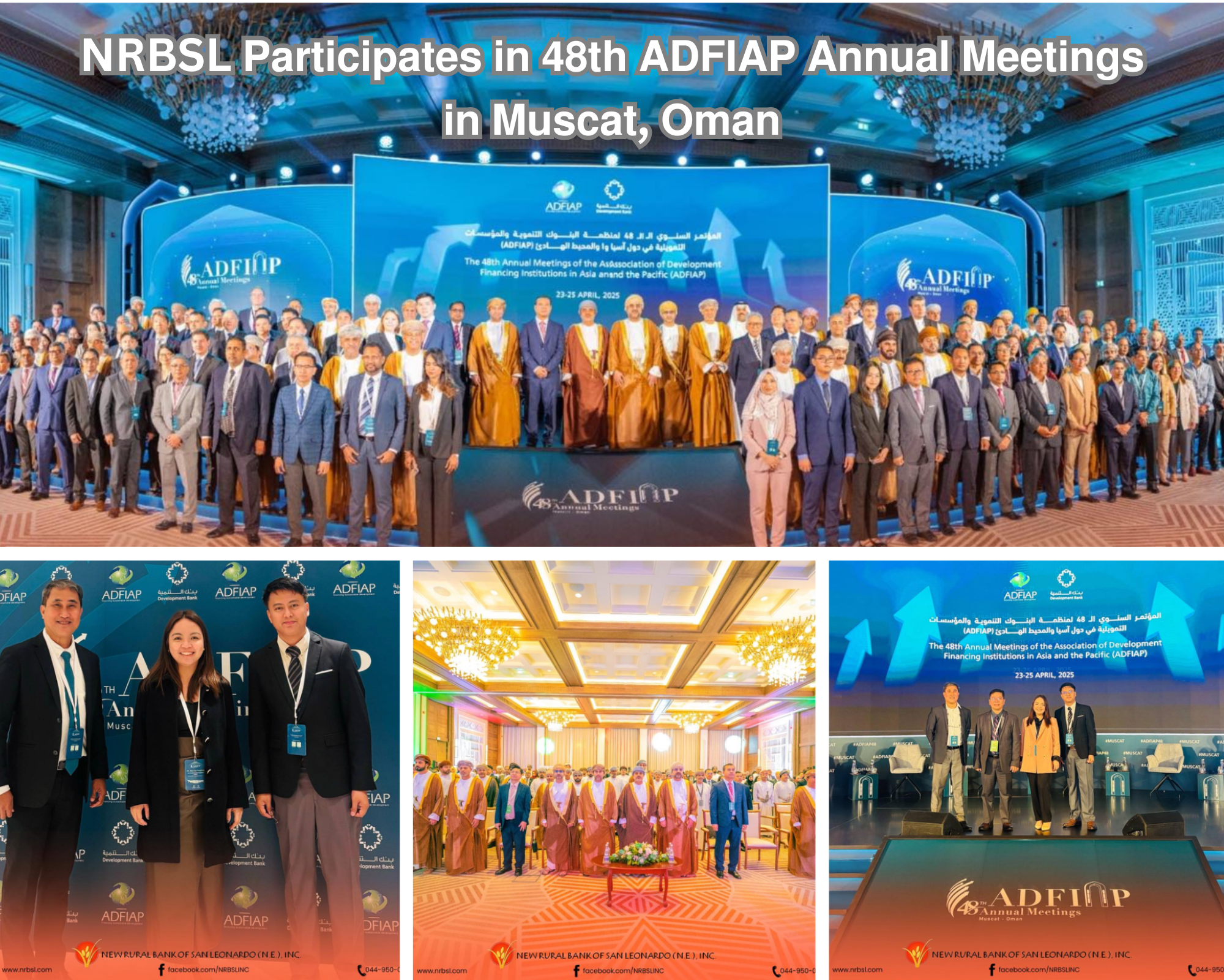 The New Rural Bank of San Leonardo (NRBSL) proudly took part in the 48th Annual Meetings of the Association of Development Financing Institutions in Asia and the Pacific (ADFIAP), held from April 23 to 25, 2025, in Muscat, Oman. This year’s 48th ADFIAP Annual Meetings hosted graciously by the Development Bank under the theme: “Economic Gardening and Development.” Bringing together member-institutions in forty-two (42) countries and territories in Asia Pacific and beyond, as well as representatives from ADFIAP’s global institutional partners and network. The event served as a vital platform for financial institutions and development organizations to share insights, experiences, and innovations aimed at fostering a sustainable finance ecosystem.See More.....