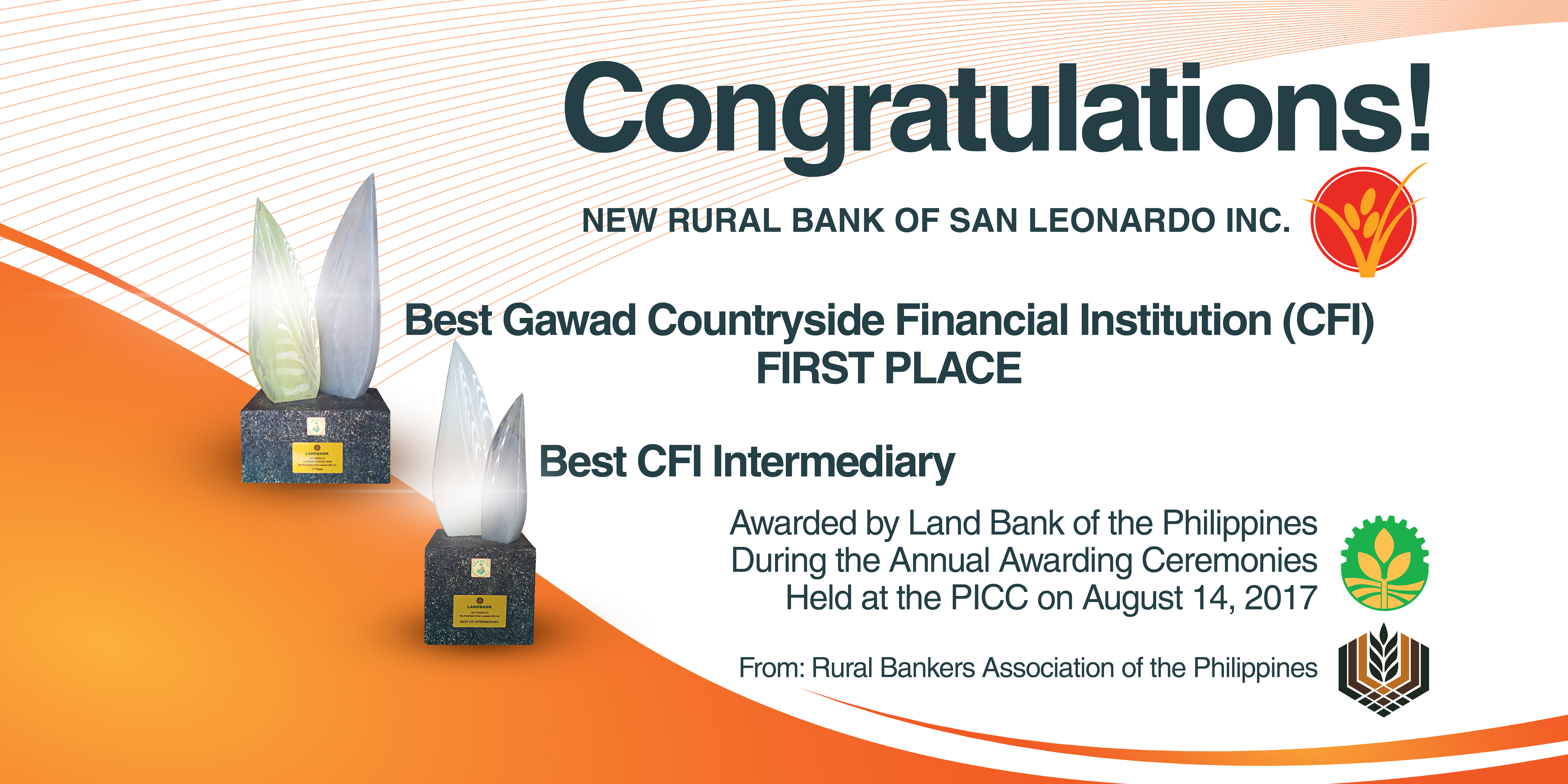 In recognition of NRBSL’s enduring support to the agricultural sector as demonstrated by its credit exposures and wide client outreach especially among small farmers and livestock raisers, the Bank garnered the First Place Award given by Land Bank of the Philippines for its “2016 Gawad Countryside Financial Institution”. The awarding ceremony was held at the Philippine International Convention Center on August 14, 2017. During the same occasion, NRBSL was adjudged as the “Best Financial Intermediary” besting other contenders in the nationwide search for best performing partners of LBP in the rural banking industry.