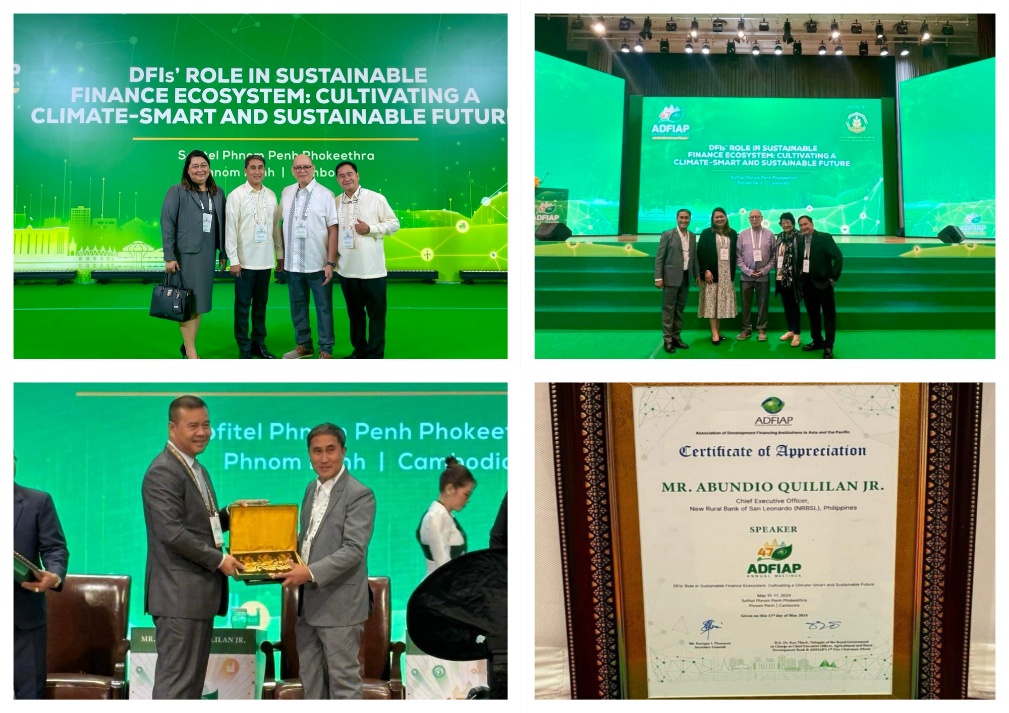 The New Rural Bank of San Leonardo continues to live up to its strategy of partnership, networking and collaboration work. Last May 15-17, 2024, at the Sofitel Phnom Penh Phokeethra, Phnom Penh, Cambodia, NRBSL took part in the 47th Annual Meetings the Association of Development Finance Institutions in Asia and Pacific (ADFIAP). A five-person delegation from the Bank's governing Board - John Mark Cajiuat, Magdalena G. Fernandez, Marcelo N. Jampil, Jubailene B. Bulawit and Abundio D. Quililan, Jr., represented NRBSL in this international gathering.