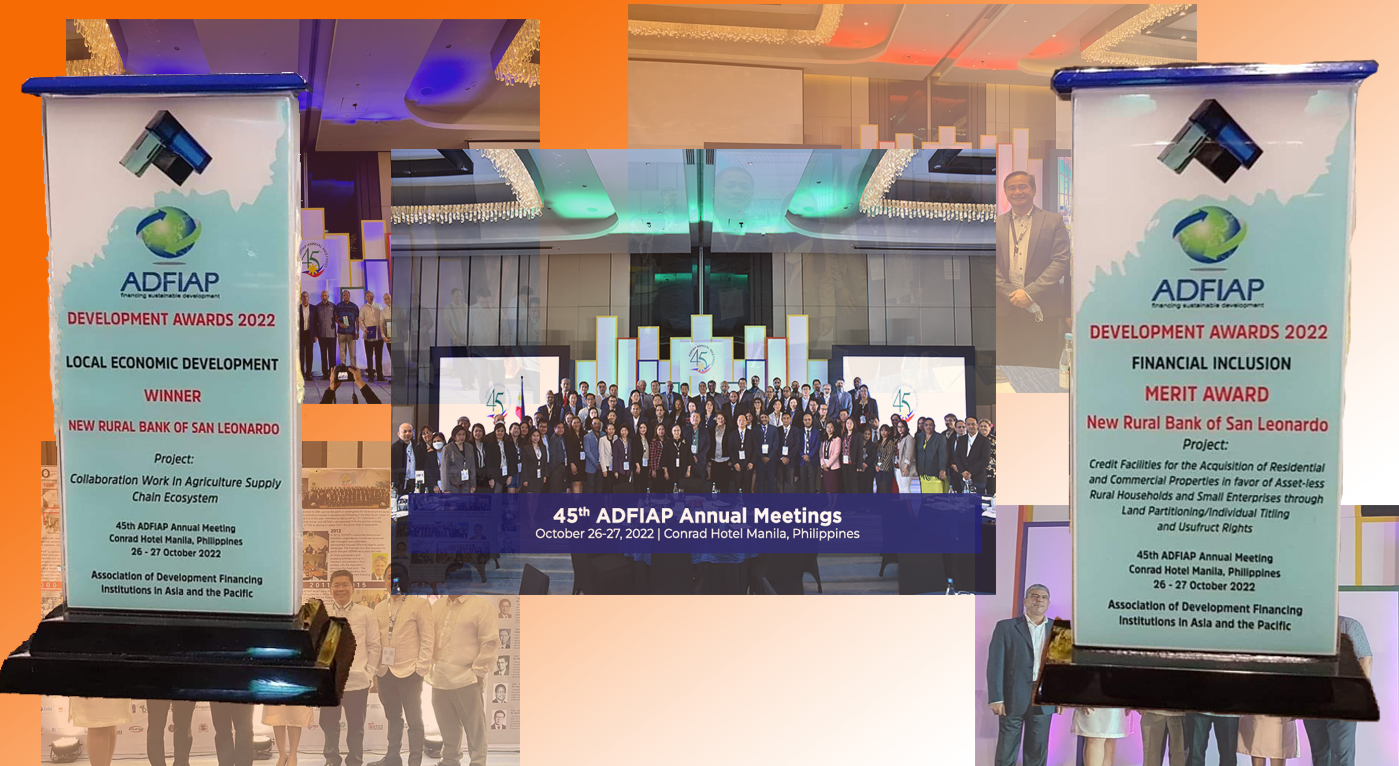 Through the encouragement of President Emmanuel Herbosa of the Development Bank of the Philippines (DBP), NRBSL became the newest member from the Philippines of the Association of Development Financing Institutions in Asia and the Pacific (ADFIAP). During its 45th Annual Meetings held in Konrad Hotel Manila on October 26, 2022, ADFIAP welcome NRBSL in the roster of 120 member-institutions engaged in the financing of sustainable development initiatives in 42 countries and territories in Asia and the Pacific. Not to be outdone by bigger organizations, NRBSL submitted two projects as entries in as many categories and won in both fields. NRBSL was adjudged as WINNER - Category 7, Local Economic Development for its project: "Collaboration Work in Agriculture Supply Chain Eco-System“ and as MERIT AWARDEE - Category 8, Financial Inclusion, for its product "Credit Facilities for the Acquisition of Residential and Commercial Properties in favor of Asset-less Rural Households and Small Enterprises through Land Partitioning/Individual Titling and Usufruct Rights”.