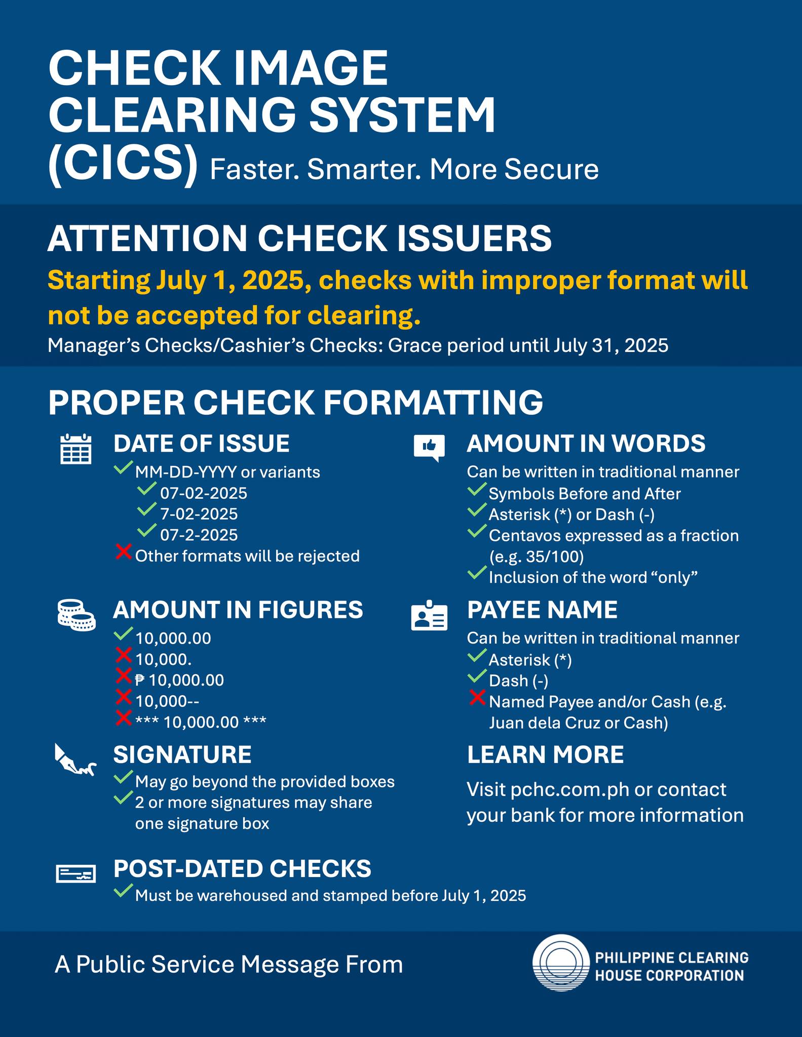 ADVISORY: Starting July 1, 2025, checks with improper formatting will no longer be accepted for clearing under the Check Image Clearing System (CICS).