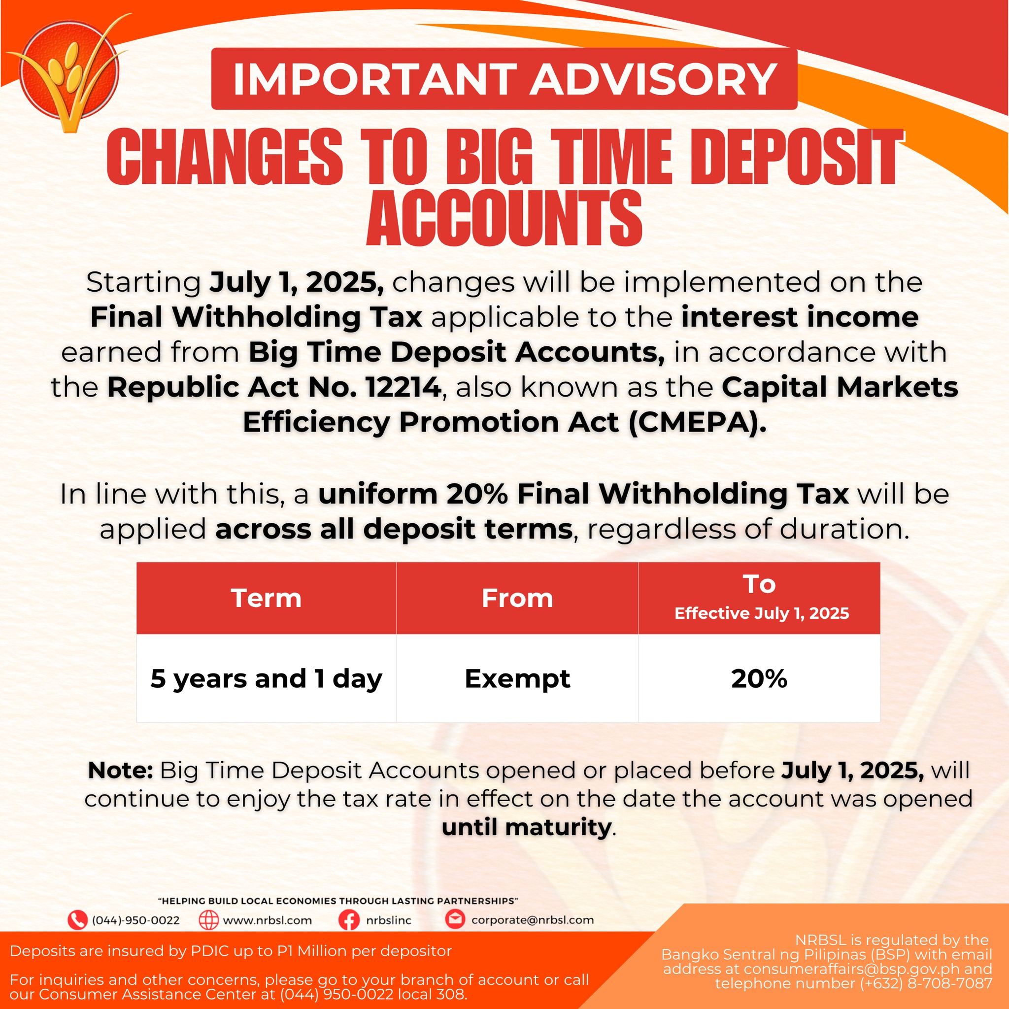 Starting July 1, 2025, changes will be implemented on the Final Withholding Tax applicable to the interest income earned from Big Time Deposit Accounts, in accordance with the Republic Act No. 12214, also known as the Capital Markets Efficiency Promotion Act (CMEPA).