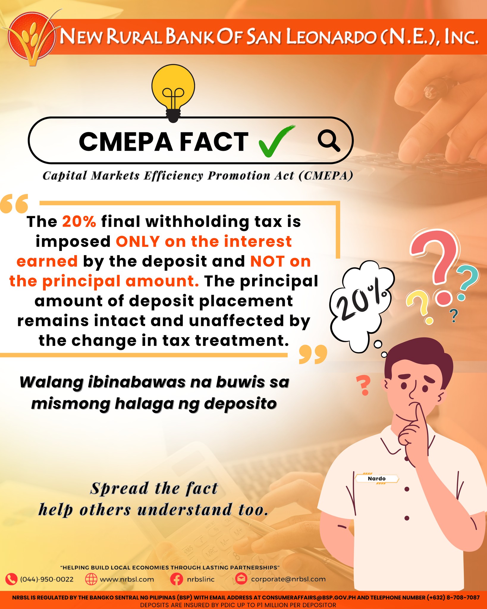 The 20% final withholding tax is imposed ONLY on the interest earned by the deposit and NOT on the principal amount. The principal amount of deposit placement remains intact and unaffected by the change in tax treatment.