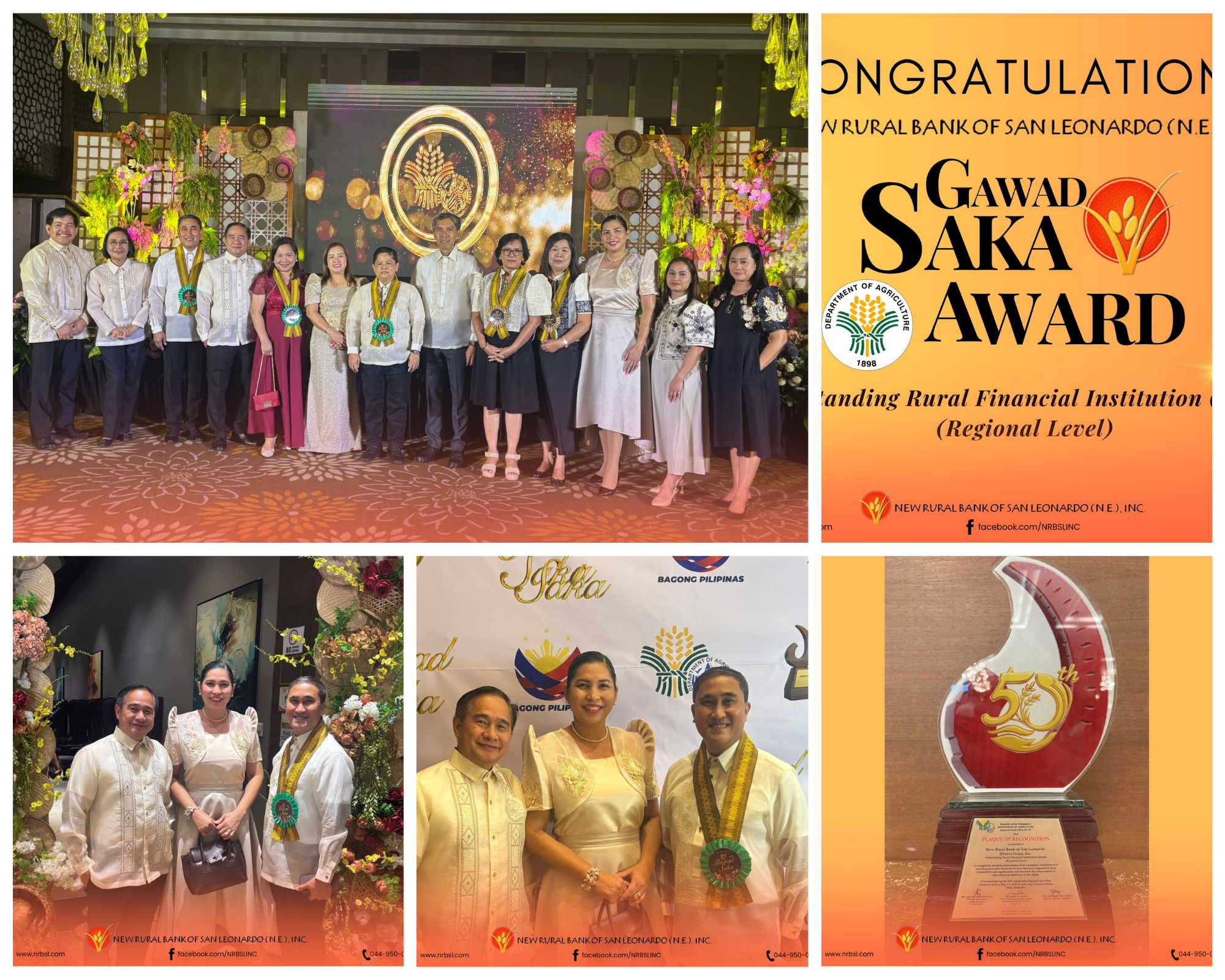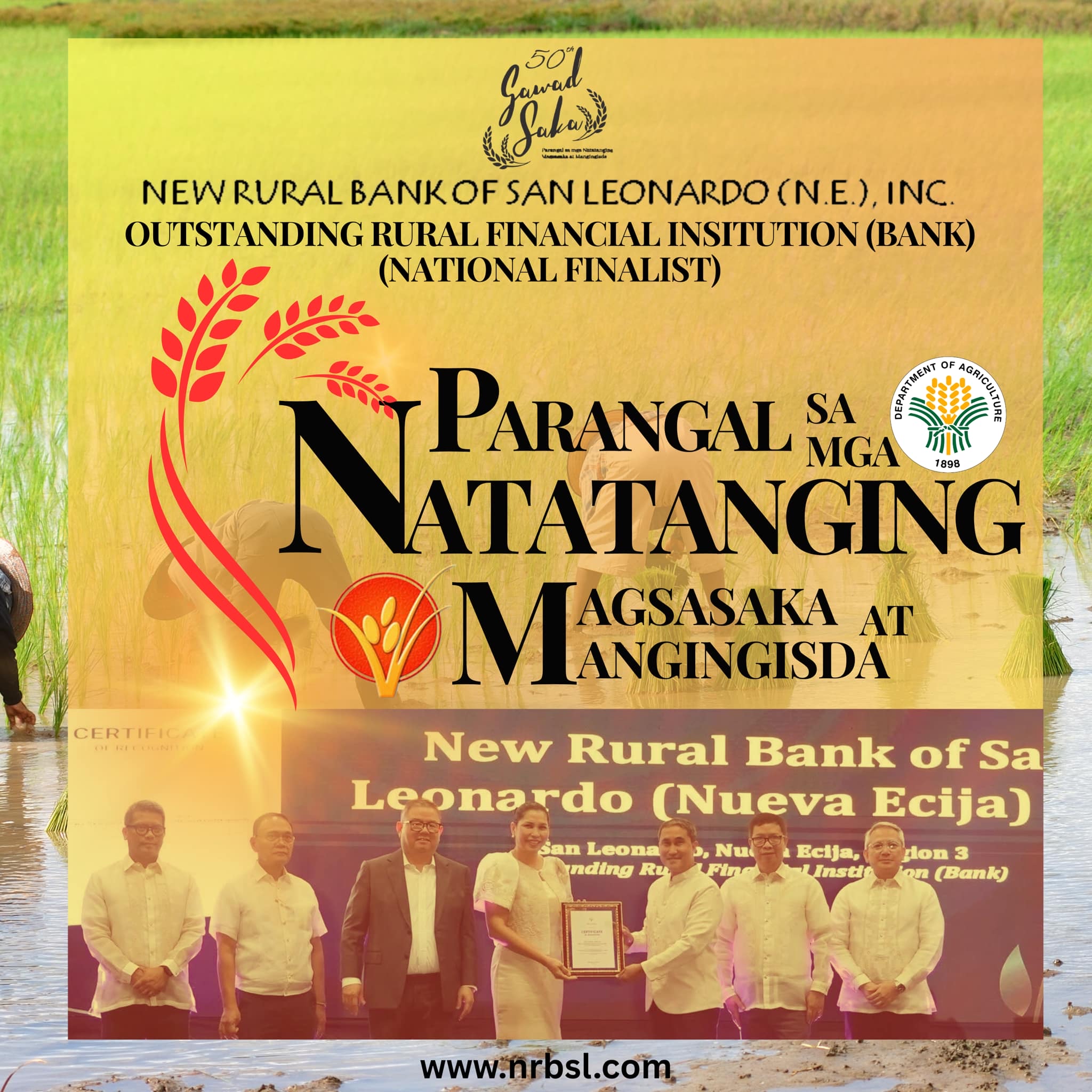 New Rural Bank of San Leonardo (N.E) Inc., named National Grand Winner for Outstanding Rural Financial Institution (Bank) during the 50th Gawad Saka: Parangal sa mga Natatanging Magsasaka at Mangingisda conferred on June 30,2025 at the Philippine Rice Research Institute in Science City of Munoz, Nueva Ecija.