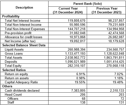 The sustained profitability of NRBSL, with income in 2024 even higher the level in the previous year, has helped duplicate the Bank’s ratio performance measured by Return-on-Equity and Return-on-Assets. The Bank managed to keep its ROE and ROA at 6.9% and 0.9% respectively which were statistically unchanged compared to previous year’s ratios. Likewise, NRBSL’s Capital Adequacy Ratio is stable at 19.55% which is a close approximation of 20% targeted level. With this profitability performance and stable liquidity condition, NRBSL made true its commitment by declaring a P7 million cash dividends for its stockholders which is P5 million higher than the amount disbursed the year thus ensuring return on their equity investments.