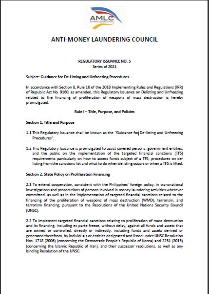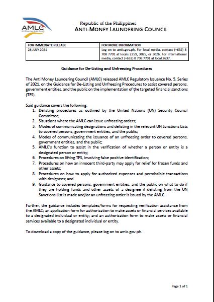 Guidance on De-Listing and Unfreezing of Funds and Other Others related to Targeted Financial Sanctions (TFS)