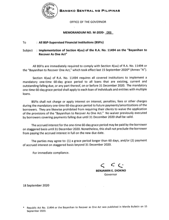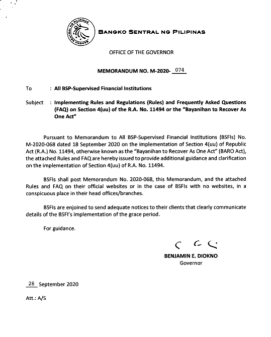 BSP Issues Memorandum No. M-2020-068 and M-2020-074 to All BSP-Supervised Financial Institutions (BSFIs)