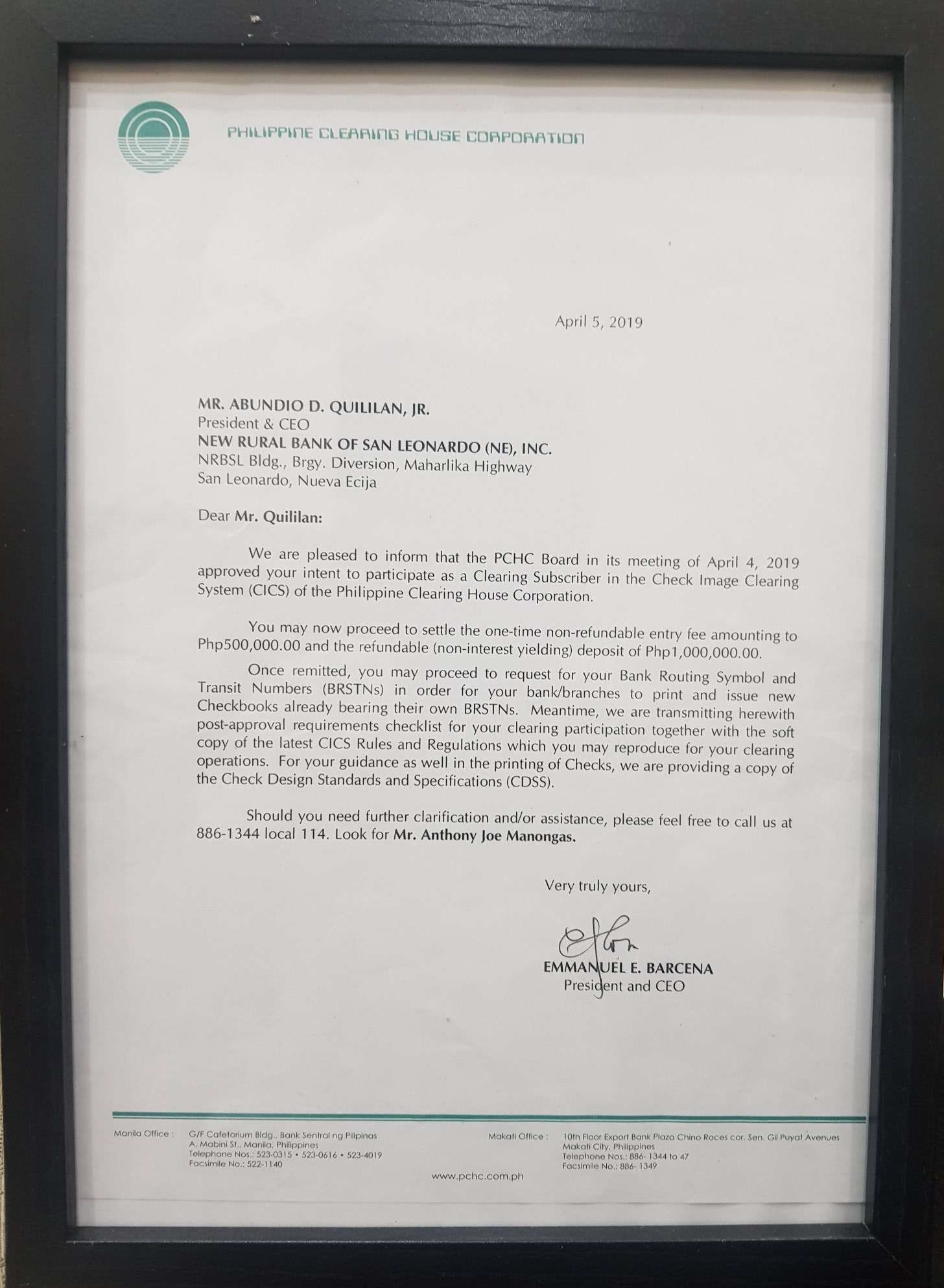 The PCHC Board in its meeting of April 4, 2019 approved the intent of NRBSL to participate as a Clearing Subscriber in the Check Image Clearing System (CICS) of the Philippine Clearing House Corporation.